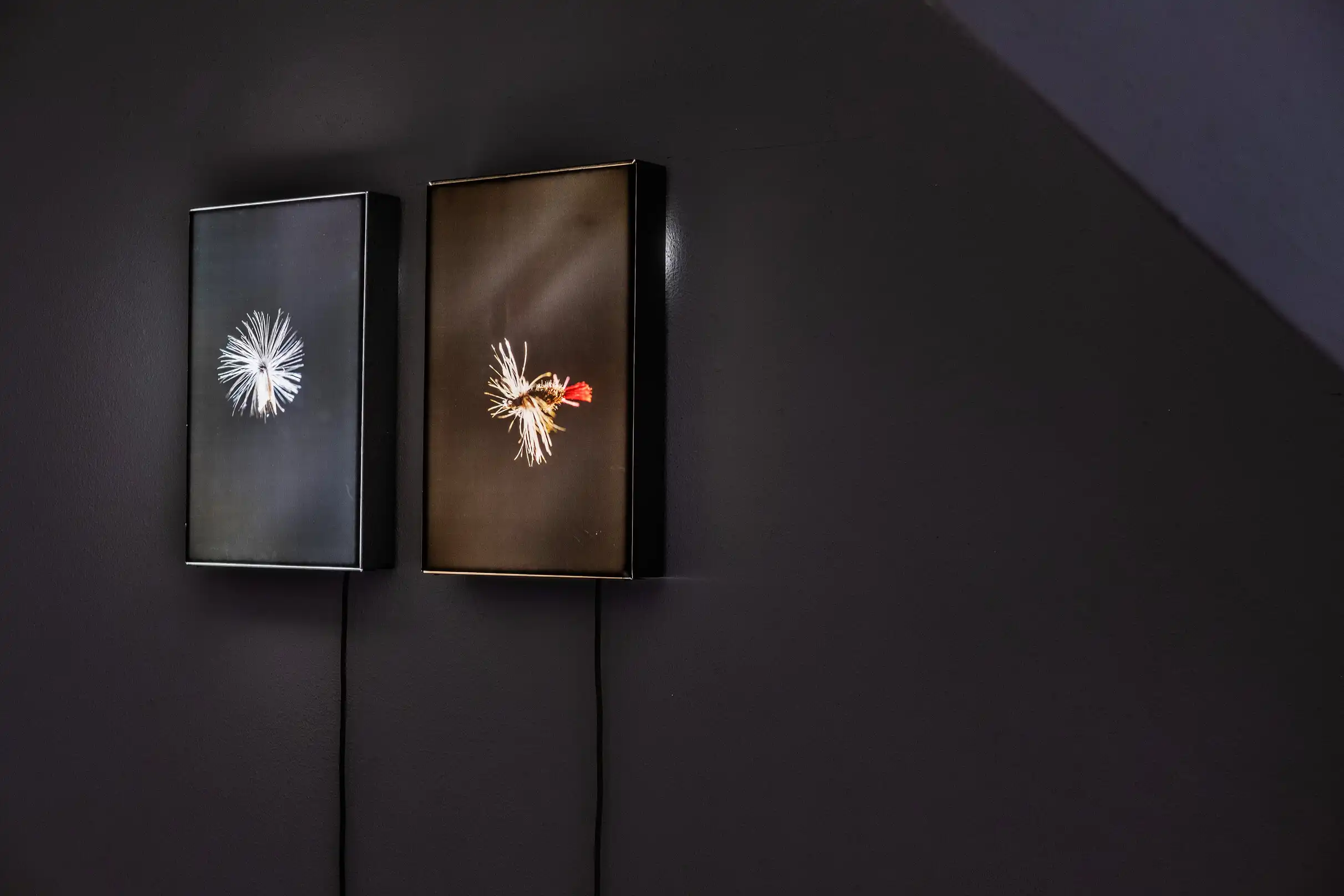 These bait objects were handmade by my grandfather and used for fly fishing. The macro photographs stage the flies as living insects, with many details. The objects, imitate real species of flies, but are not themselves intended as display objects. By photographing the individual objects, a form of conservation takes place in the sense of a caretaking for a memory object, which through the exhibition yet stands as a deceptive object in a context of a human relationship with the natural world.