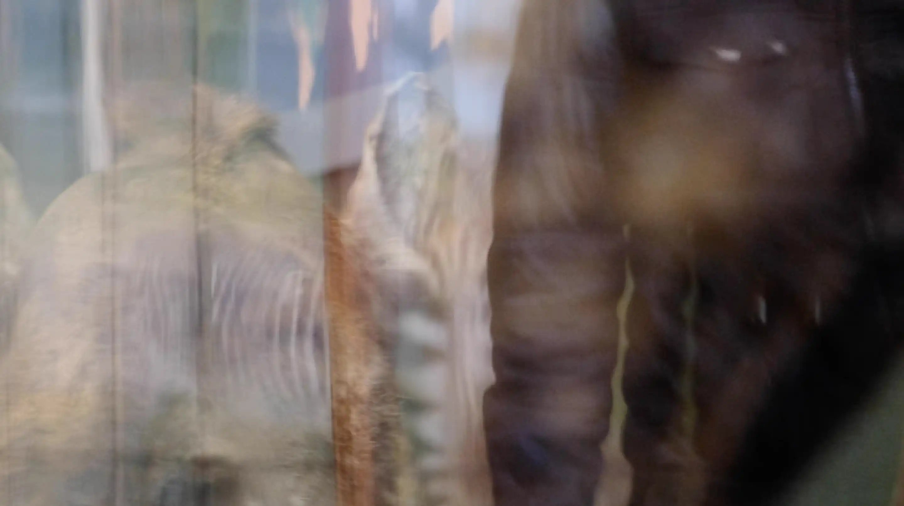 The ordered world of the taxidermic preparations with their details is withdrawn by the camera, the window pane, which actually functions as a separating element, is used as a tool to visually connect museum and diorama space, accompanied by a sound recording from inside a showcase.